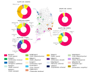 모기 종별로는 빨간집모기가 2만 3,881마리(63.1%)로 가장 많았고, 이어 흰줄숲모기 6,459마리(17.0%), 금빛숲모기 4,105마리(10.8%), 등줄숲모기 929마리(2.4%), 작은빨간집모기 557마리(1.4%) 순으로 나타났다.