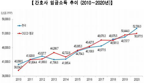 2020년 우리나라 간호사 임금소득은 연간 52,766.0 US$PPP로 OECD 국가 평균(50,977.5 US$PPP)에 비해 높았다.