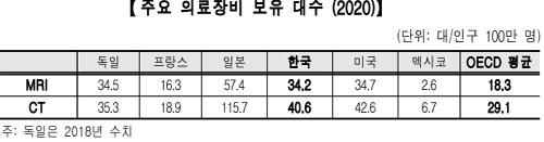 2020년 우리나라의 자기공명영상(MRI) 보유 대수는 인구 100만 명당 34.2대, 컴퓨터단층촬영(CT)는 인구 100만 명당 40.6대로 OECD 평균(29.1대)보다 많았다.