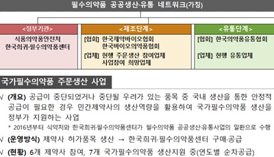 ‘필수의약품 공공생산·유통 네트워크’는 필수의약품 제조가 개시되는 단계부터 유통에 이르는 공급망 단계를 포괄하여 지원하며, 향후 주문생산 제도를 활성화하기 위한 대상 선정 및 행정적·기술적 지원 사항을 체계적으로 논의하고 제약사에 필요한 인센티브를 제도에 반영하는 것을 목표로 한다.