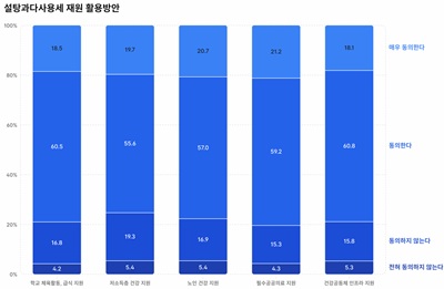 응답자들은 설탕세로 마련될 재원을 필수공공의료 인력과 시설 등 지원(80.4%), 청소년 학교 체육활동 및 급식 질 향상(79.0%), 건강공동체를 위한 공공 인프라 구축 지원(78.9%), 노인 건강 지원(77.7%), 저소득층 건강 지원(75.1%) 등에 활용해야 한다고 응답했다.