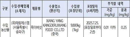 식품의약품안전처(처장 오유경)는 수입식품등 수입판매업체인 ‘(유)태림에스엠(서울특별시 송파구)’이 수입해 판매한 수입산 ‘목이버섯’에서 잔류농약(카벤다짐)이 기준치(0.01mg/kg 이하) 보다 초과 검출되어 해당 제품을 판매 중단하고 회수 조치한다고 밝혔다.