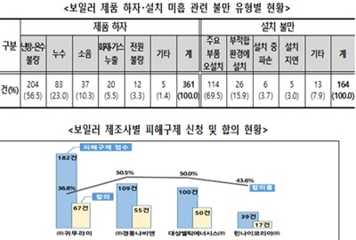 설치 불만(164건) 중에는 배관·연통 등 주요 부품 오설치가 69.5%(114건)로 대부분을 차지했다.