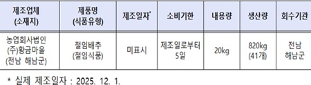 식품의약품안전처(처장 오유경)는 식품제조·가공업체인 ‘농업회사법인(주)황금마을(전남 해남군 소재)’이 제조·판매한 ‘절임배추(식품유형: 절임식품)’에 제조일자를 표시하지 않은 사실이 확인되어 해당 제품을 판매 중단하고 회수 조치한다고 밝혔다.