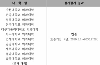 한국의학교육평가원이 2025년도 의학교육 평가인증 정기평가 결과 11개 의과대학 모두 4년 인증을 획득했으며, 중간평가 대상 7개 의과대학도 인증 유지가 결정됐다.