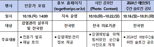 또한 감염관리 관련 학회와 협력해 ‘의료관련감염 예방관리 주간 홈페이지’를 운영하고, 의료기관 종사자 및 일반 국민을 위한 지침, 안내서, 인포그래픽 등을 게재하여 감염예방·관리를 위해 필요한 정보를 제공한다는 방침이다.