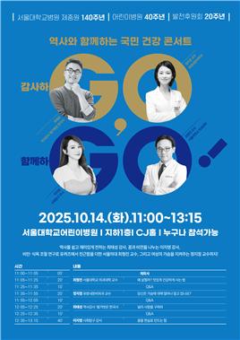서울대병원(원장 김영태)이 오는 14일(화) 오전 11시부터 13시 30분까지, 어린이병원 CJ홀에서 ‘2025 역사와 함께하는 국민 건강 콘서트’를 개최한다.
