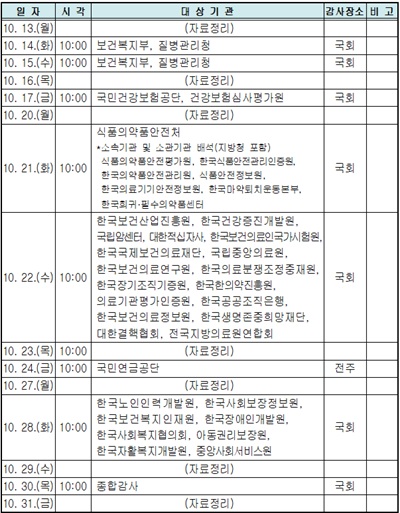 보건복지부와 질병관리청에 대한 감사는 10월 14일과 15일, 국민건강보험공단과 건강보험심사평가원은 17일, 식품의약품안전처는 21일 감사를 진행한다.