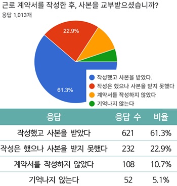 응답자의 33.6%가 근로계약서 사본을 교부받지 못했다고 답했으며, 이 중 10.7%는 아예 근로계약서를 작성하지 않았다고 응답했다.