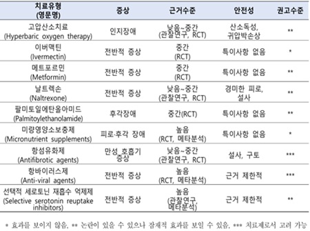 미량영양소보충제는 피로와 후각장애에 대해 높은 근거수준을 보였으며, 항바이러스제와 선택적 세로토닌 재흡수 억제제는 전반적 증상 개선에 높은 근거수준을 나타냈다.