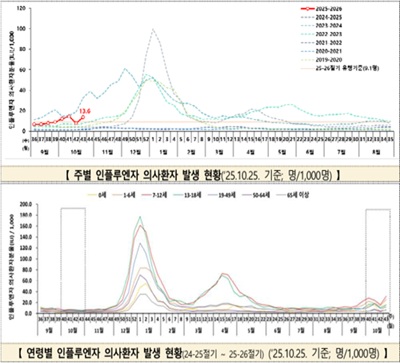 질병관리청에서 운영 중인 의원급 의료기관의 인플루엔자 의사환자 표본감시 결과, 2025년 43주차(10월 19일~25일) 인플루엔자 의사환자 분율은 외래환자 1천명당 13.6명으로 나타났다.