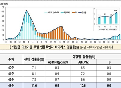 의원급 환자의 호흡기 검체에서 인플루엔자 바이러스 검출률은 43주차 11.6%로 지난 주 대비 4.3%p 증가했다.